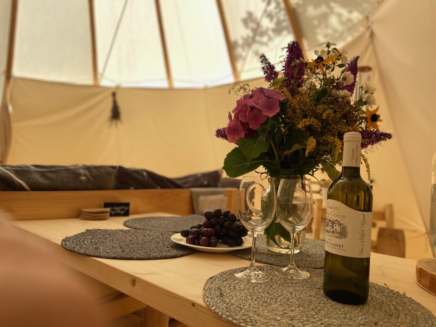 Ubytování ve stylových teepee kombinuje to nejlepší z obou světů – svobodu pobytu v přírodě a komfort jako v hotelu. Přímo z postele můžete pozorovat východ slunce nad meandry řeky Berounky, posnídat na terase obklopeni tichem lesů a večer se ohřát u ohniště s výhledem na hvězdnou oblohu.